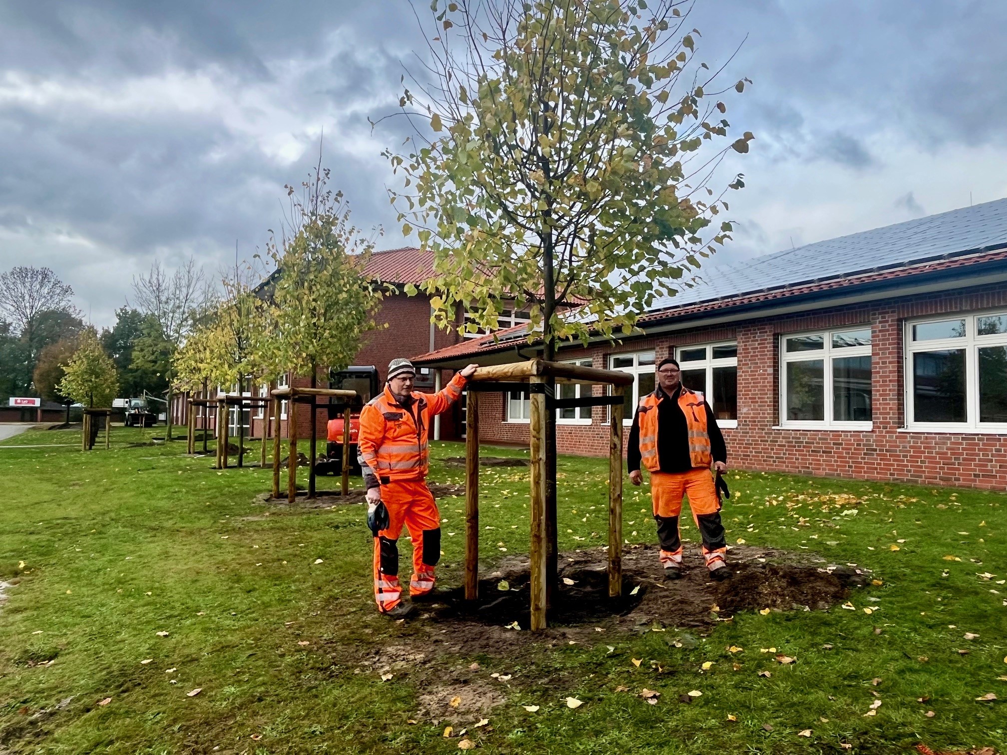 Natürliche Verschattung als Beitrag zum Klimaschutz. Entlang der Oberschule Bösel wurden elf Lindenbäume gepflanzt, um künftig für eine natürliche…